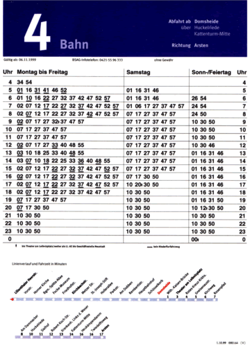 Sehr schön ist die Farbkennzeichnung der Verkehrstage mit Pastelltönen. Das erleichtert das rasche Auffinden der richtigen Tabelle. Die Farben dürfen aber nicht zu kräftig sein, sonst ist das Fahrplanbuch im Halbdunkel einer schlecht beleuchteten Haltestelle nicht mehr lesbar. Die Darstellung im Kursbuch des Karlsruher Verkehrsverbundes ist schon etwas kräftig geraten. Statt einer vollständigen farblichen Unterlegung der gesamten Fahrplantabelle kann auch das Raster der Haltestellen farbig ausgeführt werden. Für die farbliche Kennzeichnung der Verkehrstage wurde ein Punkt vergeben, der mit 100% gewichtet wurde.