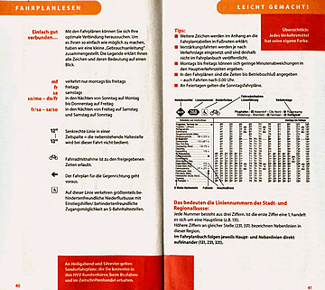 Neben einem Gesamtplan wünschen wir uns einen Übersichtsplan zum raschen Auffinden in Frage kommender Linien auf der vorderen Umschlagseite des Fahrplanbuches. Besonders attraktiv finden wir es, wenn der Übersichtsplan herausklappbar ist. Diese Pläne müssen nicht sehr detailliert sein; sie dienen vor allem dem schnellen Überblick. Wie komme ich vom Ort A in den Ort B, welcher Bus fährt in den Stadtteil C? Für das Vorhandensein eines solchen Planes gab es einen Punkt, der zu 250% gewichtet wurde. Ein solcher Übersichtsplan kann einen Gesamtplan, auf dem alle Haltestellen verzeichnet sind, jedoch nicht ersetzen.