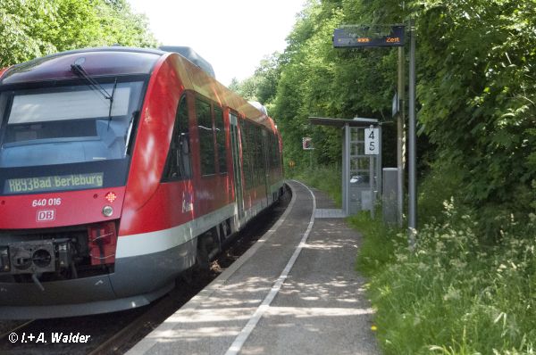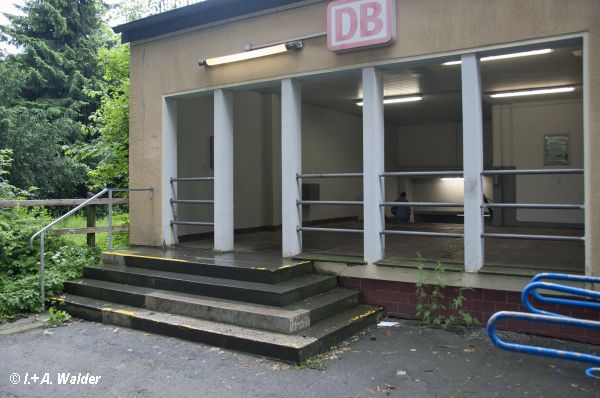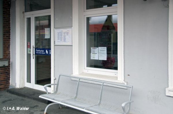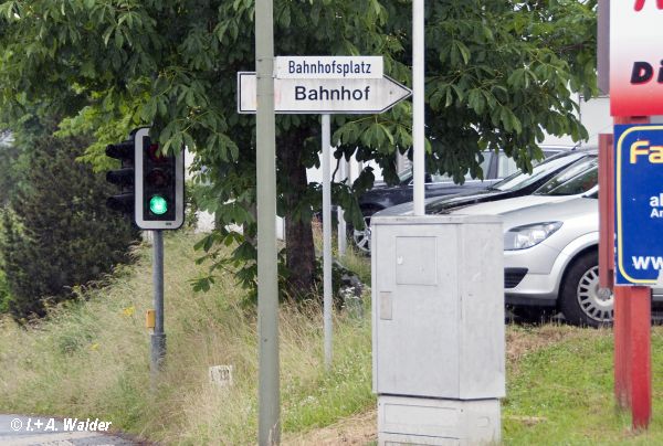 Hinweis zum Bahnhof fast nicht sichtbar (es ist auch nur ein Haltepunkt und kein Bahnhof)