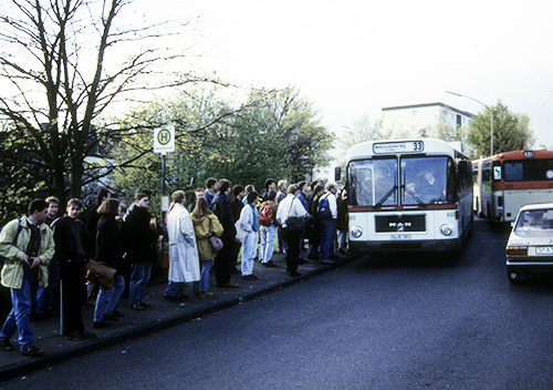 Letzten Monat bot sich den Fahrgästen auf den direkt zur Hochschule führenden Linien 33/41 ein unangenehmes Bild. Viele Busse erreichten erst starkverspätet die Haltestelle; die Abfahrt verzögerte sich durch den Fahrscheinverkauf noch weiter. Die Fahrer verzichteten teilweise auf die ihnen zustehende Pause. Zu Veranstaltungen kam, wer sich am Fahrplan orientierte, verspätet. Anschlüsse wurden nicht erreicht. Über die Ursachen und Folgen dieses Umstandes diskutierte kürzlich der Arbeitskreis der Universität-Gesamthochschule Siegen in kleinem Rahmen. Die Vor!esungszeit der Hochschule beginnt und endet zur Monatsmitte. Da die VWS aber weder Schülerwochenkarten noch Mehrfachfahrkarten (,Zehnerkarten' oder Streifenkarten) ausgibt, sind die Siegener StudentInnen in den ersten Wochen auf Einzelfahrscheine angewiesen. Da keine Fahrkartenautomaten aufgestellt sind, muß der Fahrer jeden Fahrgast einzeln bedienen. Die ärgerlichen Folgen machen sich gerade zu Semesterbeginnn unangenehm bemerkbar. Die Erstsemesterstudenlnnen haben meist noch keine feste Wahl des Verkehrsmittels getroffen. Wenn sich dann der Bus als zuverlässig erweist (was in den übrigen Monaten normalerweise nicht der Fall ist!) wird dauerhaft ein Fahrgastpotential vergrault. In anderen Hochschulstädten (z. B. Kaiserslautern) gehen die Verkehrsbetriebe den umgekehrten Weg und bieten den StudentInnen ein kostenloses Schnupperticket für die erste Vorlesungswoche an. Andere Städte - Andere Sitten. Der Arbeitskreis fordert deshalb die Politker. auf, baldmöglichst Mehfachfahrkarten die auch am 15. eines Monats beginnen kann einzuführen.