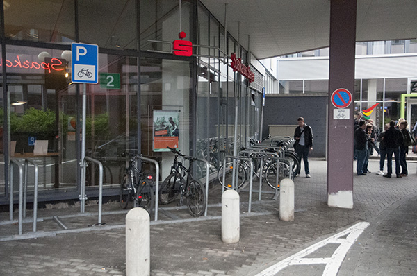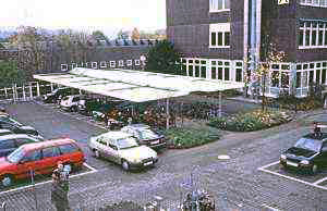 Ein Ergebnis der Verkehrsumfrage des AK-Verkehr war: Täglich fahren bis zu 400 Studenten und Bedienstete mit dem eigenen Fahrrad zur UNI-Siegen aufden Haardter Berg. Doch gab es im Bereich der Hochschule bisher kaum geeignete Abstellplätze für die recht teuren Zweiräder, die auch vor Langfingern sicher sein sollen. Die Folge war, daß Bedienstete und Studenten ihre Räder die Treppenaufgänge hinaufschleppten, um sie dann an den Geländern oder in den Arbeitsräumen abzustellen. Teilweise versperrten die Räder, wenn sie an den Geländern angekettet waren, die Fluchtwege in den Treppenhäusern. Ein Antrag an die Hochschulverwaltung, für die Anschaffung von Ständern Gelder bereitzustellen, war allerdings zum Scheitern verurteilt. Auf der Suche nach einem entsprechenden Titel hatte man den Haushaltsplan hin- und hergewälzt. Aber im ansonsten mit Titeln reichlich ausgestatteten Haushalt ausgerechnet für Fahrräder keinen gefunden. So blieb dem Arbeitskreis nur die Suche nach privaten Spenden. Insgesamt 400 Fahrradstellplätze mit einen Kostenvolumen von rund 20.000 DM wurden geplant. Am 24. August stellte Achim Walder während eines Pressegespräches die ersten sechs Abstellanlagen an der Mensa vor. Sie wurden von Dr. Reinhold Schultze, der Ökologischen Partei Deutschland, der Firma Lachmann und Rink aus Kreuztal, der Firma Kunze aus Netpen, von Frau Bürgermeisterin Hilde Fiedler, den Weißtal-Werken, dem ADFC-Siegen-Wittgenstein und der Siegener Zeitung gespendet. Rektor Prof Dr. Klaus Sturm bedankte sich bei der Übergabe trotz aller Rückschläge, für den langen Atem des Arbeitskreises. In Zusammenarbeit mit dem ADFC wurden die Aufstellungspläne am Bildungshügel erstellt - nicht immer mit dem Einverständnis der Hochschulverwaltung.