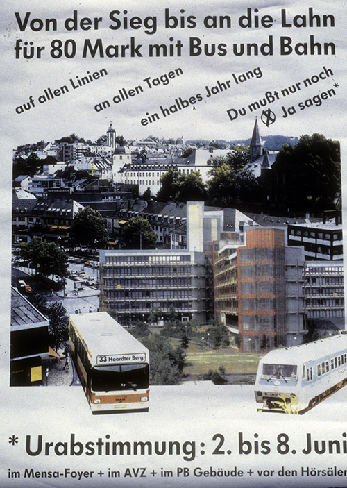 Ende 1991 erreichte den Arbeitskreis die Nachricht über ein Semesterticket an der UNI-Darmstadt. Daraus entstand die Idee, dieses Konzept auch in Siegen umzusetzen. Mit den Daten aus der eigenen Erhebung konnte der Arbeitskreis Berechnungen für ein Semesterticket für die UNI-Siegen erstellen. Geplant war ein Ticketpreis von 70,-DM für Bus und Bahn in den Kreisen Siegen-Wittgenstein und Olpe. Fast zwei Jahre dauerte es, bis die Mitglieder des AK-Verkehr die Verkehrsunternehmen von diesem Projekt überzeugt hatten. Hilfreiche Unterstützung leistete Prof. Dr. Heiner Monheim vom Verkehrsministerium in Düsseldorf, das den Verkehrsunternehmen die garantierten Einnahmen vorrechnete.